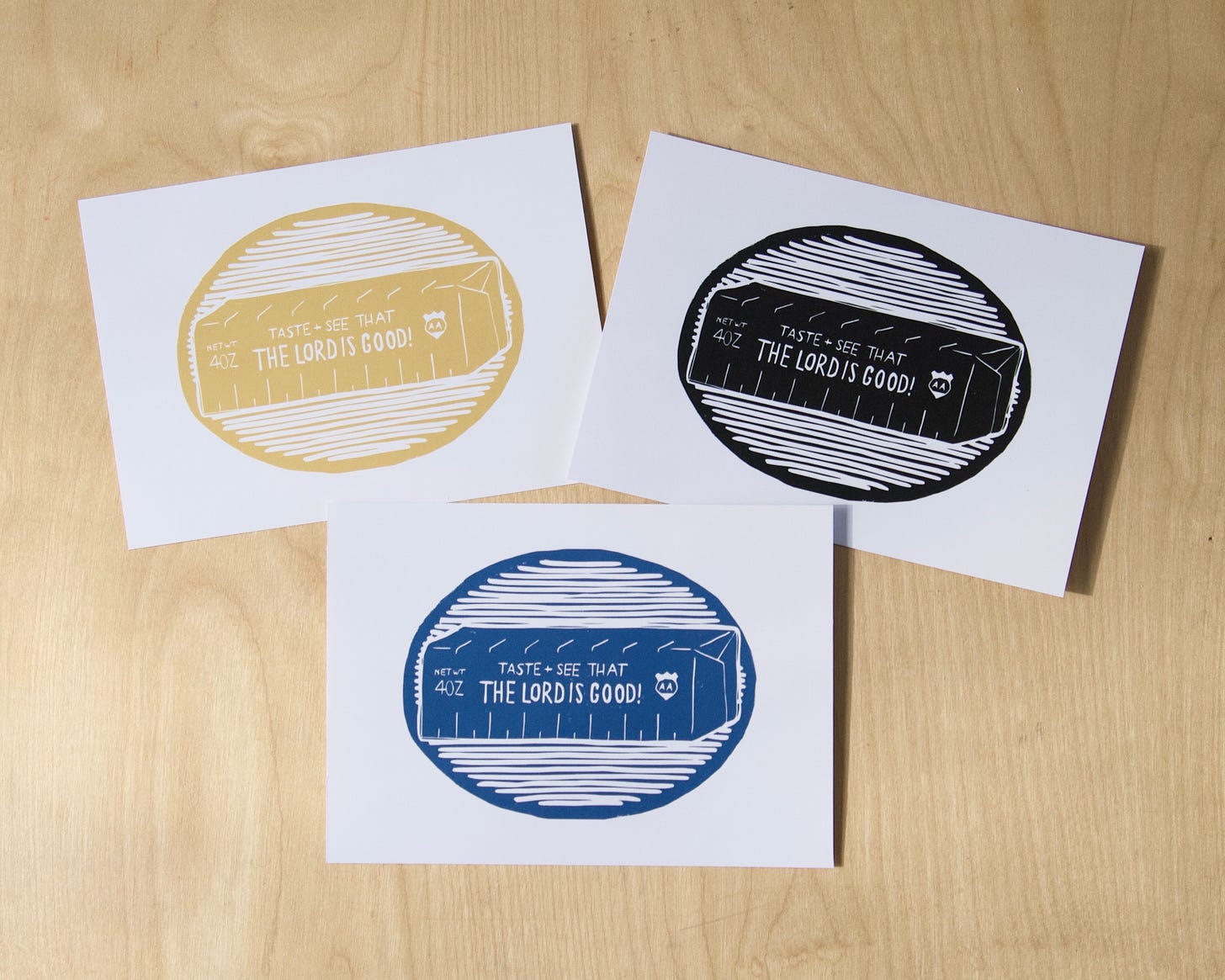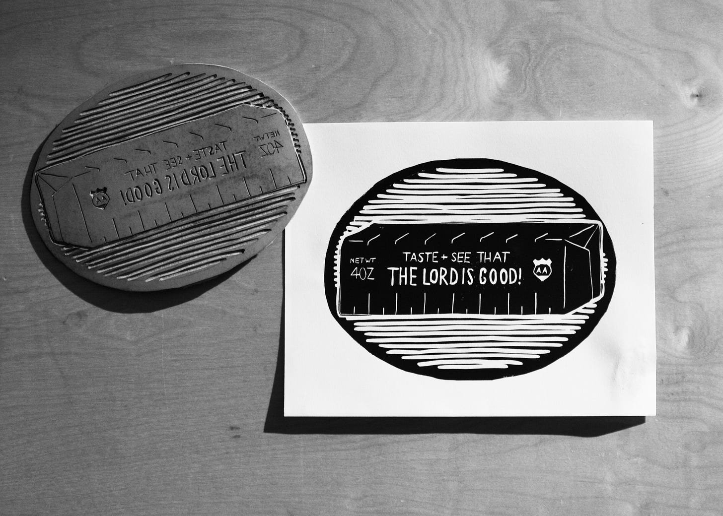 To celebrate the opening of this new chapter, I’ve designed a linocut print that will only be available as a free, downloadable, and printable digital file (in three color options!) for subscribers. The print features Psalm 34:8, “Taste and see that the LORD is good,” inscribed onto a stick of butter; because let’s be real, if there’s any experience that leads me to praise God for the gift of my embodied existence, surely it’s that of eating fresh bread with a thick slab of salted butter.